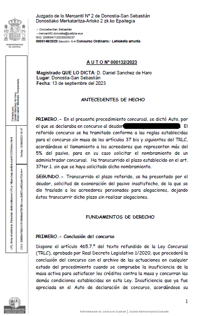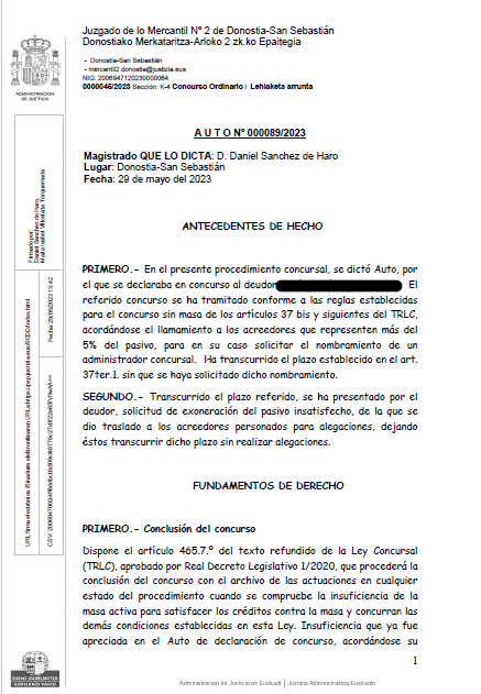 Nuestro cliente obtiene la exoneración de las deudas orginadas por la explotación de un negocio de hostelería. Tras someterse al procedimiento de Segunda Oportunidad se le condonan las deudas en las que incurió para sostener la actividad que se vió forzado a cerrar.   Auto concesión Exoneración Pasivo Insatisfecho