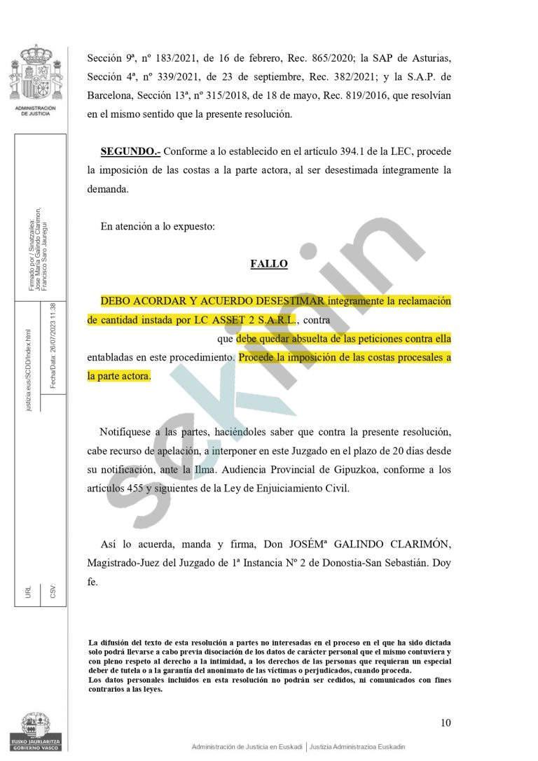 LC ASSET 2 S A.R.L. pierde un juicio con un contrato del 21,99% TAE y es condenada a pagar las costas